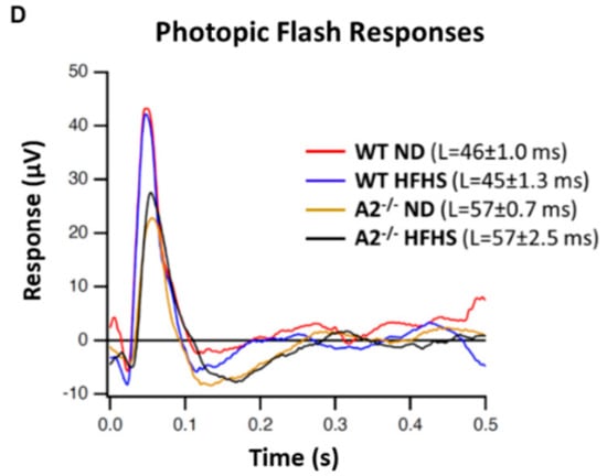 Neurological deficits in the retina and abnormal response to light are considered important components of diabetic retinopathy progression [31,32,33]. In this study, a-wave amplitude was similar among all four groups (Figure 6A). However, WT mice fed the HFHS diet exhibited a significant increase in b-wave amplitude compared to the WT ND group (Figure 6B). A2−/− mice fed HFHS showed responses similar to those seen in the ND-fed mice. Amplitudes of c-waves differed significantly at some intensities (Figure 6C). No significant differences were seen in latencies of the a-wave, b-wave and c-wave. Photopic response amplitudes were reduced for brief flashes in the A2−/− mice. Latencies were also significantly longer for the A2−/− groups (Figure 6D).