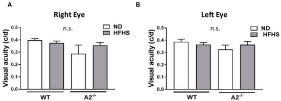 To evaluate retinal function after 16 weeks on the HFHS diet and to assess the effect of A2 deletion, electroretinography (ERG) and visual acuity tests were performed. In the current study, WT, but not A2−/− mice, fed the HFHS diet showed abnormally elevated b-wave responses to light. This could be attributed to their hyperglycemic state, which is characterized by increased intracellular levels of Ca2+ and cGMP, that may increase response amplitudes and sensitivity to light stimuli [53]. Other studies have shown that scotopic responses are lower in models of high fat diet-induced obesity [54,55]. Another study showed impaired electroretinogram (ERG) responses after 6 months of high fat diet consumption [4]. In clinical settings, diabetic patients can present with subnormal, supernormal as well as normal electroretinogram (ERG) responses compared to healthy subjects [56,57].