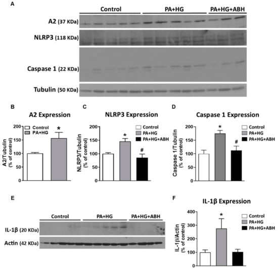Inhibition of arginase limited inflammasome activation in bovine retinal endothelial cells (BRECs) treated with palmitate and high glucose (PA+HG). Representative western blots (A) of BRECs treated for 72 h with 100 µM palmitate and 25 mM of glucose (PA+HG) in the presence or absence of 2(S)-amino-6-boronohexanoic acid (ABH) showing the expression of A2 (B) and components of the inflammasome: nucleotide-binding oligomerization domain (NOD)-like receptor pyrin domain-containing protein 3 (NLRP3) (C), caspase 1 (D) and pro-interleukin-1 β (pro-IL-1β) (E,F) (n = 4–6 per group). Data are presented as mean ± SEM (standard error of the mean). * p < 0.05 compared to control (bovine serum albumin (BSA)-treated) group, # p < 0.05 compared to PA+HG treated group.