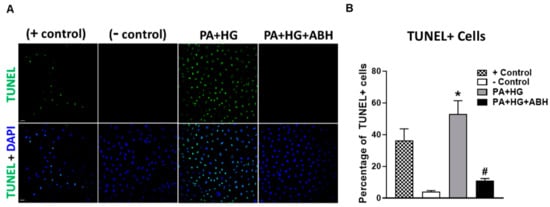 Additionally, we examined the effects of PA+HG on BREC apoptosis using a terminal deoxynucleotidyl transferase dUTP nick-end labeling (TUNEL) kit. DNase I was used as a positive control. Compared to BSA-treated cells, PA+HG treated cells showed a significant increase in TUNEL positive cells, which was blocked by pretreatment with ABH (Figure 9A,B).