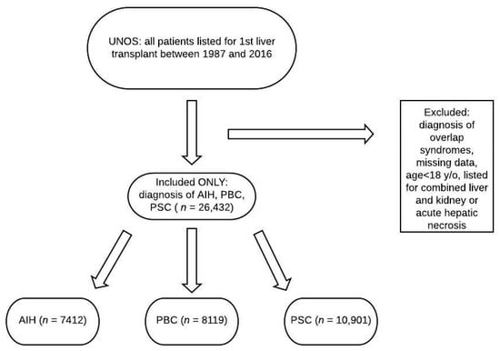 Flowchart of patients reviewed. UNOS: United Network for Organ Sharing; AIH: autoimmune hepatitis; PBC: primary biliary cholangitis; PSC: primary sclerosing cholangitis.