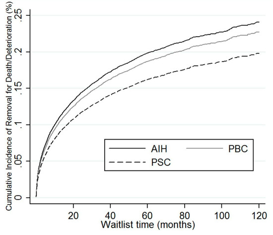 Competing risk regression of AIH, PBC, and PSC demonstrating relative removal from waitlist for death or deterioration. AIH: autoimmune hepatitis; PBC: primary biliary cholangitis; PSC: primary sclerosing cholangitis.