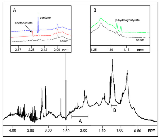 Nuclear Magnetic Resonance (NMR) signal peaks for the three ketone bodies in a spectrum of serum from a 400 MHz clinical NMR analyzer. The signals from the methyl groups on β-hydroxybutyrate (β-HB), acetoacetate (AcAc) and acetone overlap with signals that arise from the protons on lipid molecules contained within lipoprotein particles (for β-HB) and residues on the backbones and carbohydrate side-chains of proteins (for AcAc and acetone). Insets: Expanded views of NMR spectra from serum alone compared to serum spiked with either AcAc (red) and acetone (blue) (single peaks/singlet; inset (A) or β-HB (green; two peaks/doublet; inset (B) in order to confirm the relative positions and multiplicity (singlet or doublet) of the signals that were used for quantification. ppm = parts per million.