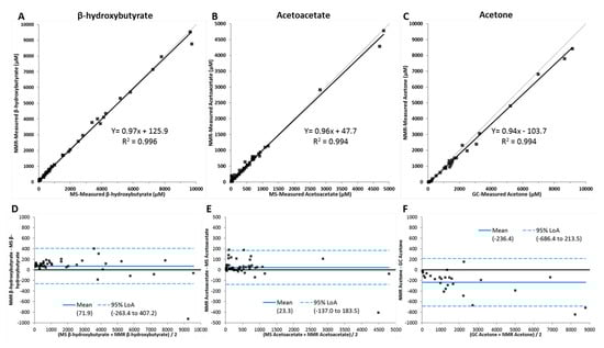 Deming regression comparison between LC/MS/MS or gas chromatography and NMR measured (A) β-hydroxybutyrate (n = 50), (B) acetoacetate (n = 50), and (C) acetate (n = 27) in serum samples. Bland–Altman plots for (D) β-hydroxybutyrate, (E) acetoacetate, and (F) acetone assays. The limits of agreement (LOAs) are depicted as dotted blue lines and the 0% bias is a solid black line.