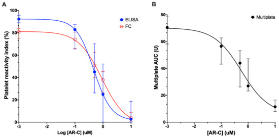 Sample size was based on the recommendations from the Clinical and Laboratory Standards Institute [8]. Twenty-four independent qualified reference individuals with 5 concentration–response samples per participant provided 120 samples for analysis, consistent with guideline provisions for verification of reference intervals in clinical laboratories. Concentration–response curves for each method were fitted using a four-parameter logistic model using Prism 8 (Graphpad Software, Inc., La Jolla, CA, USA). The relationship between ELISA, FC, and Multiplate® was assessed by the Pearson correlation coefficient and a linear regression analysis. Continuous variables were reported as median (interquartile range (IQR]). Inter-method reliability comparing ELISA with FC assays were assessed through Bland–Altman 95% limits of agreement and Intraclass Correlation (ICC). Data were categorized based on cut-offs of <19, 19–46, and >46 U for the Multiplate® analyzer and <16, 16–50, and >50% for the VASP assay for low, optimal, and high platelet reactivity [4]. The agreement between VASP by ELISA and FC and Multiplate® assays was assessed with the kappa statistic. A value of p < 0.05 was considered significant. Statistical analyses were performed using IBM SPSS Statistics for Macintosh, Version 25.0 (Armonk, NY, USA).