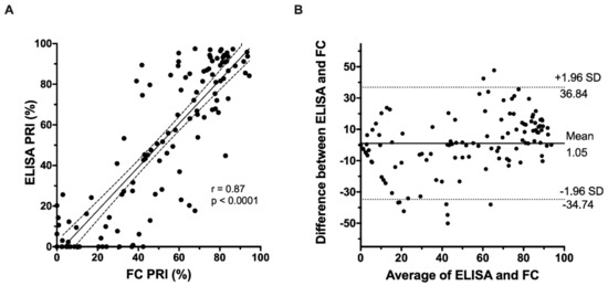 PRI values measured by ELISA and FC were strongly positively correlated (r = 0.87, p < 0.0001, as seen in Figure 2A). Bland–Altman analysis (n = 120 observations) was also performed to assess the inter-method reliability of the ELISA and FC assays. The results, as seen in Figure 2B, demonstrate a mean difference between the two assays of 1.05%, with limits of agreement from −34.7% to 36.8%, indicating that systematic bias was minimal, but individual differences could be large.