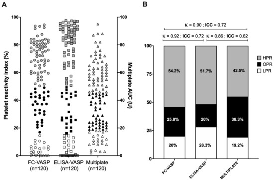 (A) Classification of individual samples into high, optimal, and low platelet reactivity. Analysis is based on cut-offs of <19, 19–46, and >46 U for the Multiplate® analyzer and of <16, 16–50, and >50% for the VASP assays for low, optimal, and high platelet reactivity (cut-offs based on Aradi et al. [4]). (B) Data expressed as proportion within the therapeutic window by the different platelet function tests.