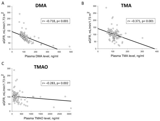 Using data pooled from all subjects, correlations between plasma and urinary methylamine levels and CV risk factors were analyzed (Table 4). We observed that urinary DMA level was negatively correlated with awake SBP load (r = −0.235, p = 0.043), asleep SBP load (r = −0.289, p = 0.012), awake DBP load (r = −0.288, p = 0.012), and LV mass (r = −0.554, p < 0.001). Additionally, LV mass exhibited negative correlations with urinary TMA (r = −0.226, p = 0.016) and TMAO levels (r = −0.324, p < 0.001). In CKD children and adolescents, there were significantly inverse correlations between eGFR and plasma DMA (r = −0.718, p < 0.001), TMA (r = −0.371, p < 0.001), and TMAO (r = −0.283, p = 0.002) (Figure 1).