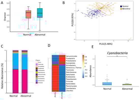 (A) Fecal bacterial α-diversity in CKD children with normal and abnormal ABPM represented by the Shannon’s diversity indexes. (B) β-diversity changes in gut microbiota between CKD children with normal and abnormal ABPM by the partial least squares discriminant analysis (PLS-DA). (C) Relative abundance of top 10 phyla of the gut microbiota between the normal and abnormal ABPM group. (D) Heat map of 16S rRNA gene sequencing analysis of gut microbiome at the phylum level. (E) The abundance of phylum Cyanobacteria in CKD children with normal vs. abnormal ABPM. The asterisk indicates p < 0.05.