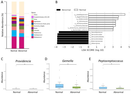 (A) Relative abundance of top 10 genera of the gut microbiota in CKD children with normal and abnormal ABPM group. (B) Linear discriminant analysis effect size (LEfSe) to identify the taxa that were significantly different between normal vs. abnormal ABPM group. The threshold of the linear discriminant was set to 3. (C) The abundance of genus Providencia, (D) Gemella, and (E) Peptosreptoccocus in CKD children with normal vs. abnormal ABPM. The asterisk indicates p < 0.05.