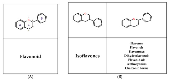 Flavonoids share a common chemical structure (Figure 1A) based on a C6-C3-C6 skeleton, where two aromatic rings are linked by a three-carbon chain that forms an oxygenated heterocyclic ring [42,43,44]. Depending on the degree of unsaturation and the substitution pattern, different flavonoid classes can be distinguished (Figure 1B): flavones, flavonols, flavanones, flavan-3-ols, anthocyanins, dihydroflavonols, and isoflavones, as well as the biogenetic intermediate chalconoid forms [43].