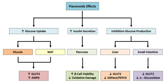 In summary, flavonoids exert their anti-diabetic effects in part by acting on different tissues (pancreas, liver, adipose tissue and skeletal muscle) involved in the modulation of glucose homeostasis and insulin sensitivity (Figure 2).