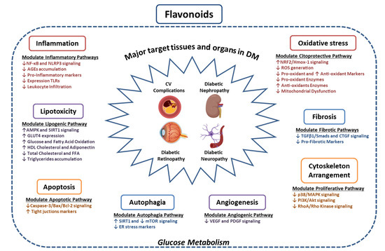 It is well known that DM increases cardiovascular morbidity and mortality. However, surprisingly in the last years, the role of flavonoids on cardiovascular complications associated with DM has been poorly studied compared to other diabetic complications such as retinopathy or nephropathy. Most of the studies are focused on assessing the role of flavonoids on endothelial dysfunction since it is one of the earliest and most prevalent abnormalities of cardiovascular complications associated with DM [101].