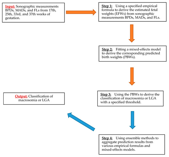 Here, we developed a four-step ensemble learning procedure to predict macrosomia or LGA from prenatal ultrasound measurements. The output of the learning procedure is the binary classification of either macrosomia or LGA. The prediction of macrosomia and LGA is conducted based upon a set of input features. The primary input features are the sonographic measurements BPDs, MADs, and FLs collected from 17th, 25th, 33rd, and 37th weeks of gestation, as well as gestational age at delivery, in the Scandinavia SGA study. Other features also include maternal age, pre-pregnancy body mass index, parity, smoking status, existing diabetes, and gestational diabetes. Figure 1 shows a diagram that delineates the four steps in the ensemble learning procedure, to predict macrosomia or LGA. Step 1 is to take the sonographic measurements for each of the gestational weeks and each of the empirical formulas in Table A2, to obtain EFWs at each gestational time point. Step 2 is to fit either a nonlinear mixed-effects model or a quadratic mixed-effects model to predict the corresponding PBWs at birth from the EFWs obtained in Step 1. Step 3 is to use the PBWs to derive the classification of macrosomia or LGA by using a specified threshold. Step 4 is the ensemble learning step, in which prediction output from various empirical formulas and the nonlinear and quadratic mixed-effects models are combined to generate the ensemble learning prediction results.