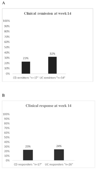 At week 14, 17/74 (23%) CD patients and 34/107 (32%) UC patients were in clinical remission (Figure 1A). In CD, a mild clinical activity at baseline was significantly more frequent in the group of remitters (11/17, 65%) than in the group of the non-responders (7/40, 18%; p = 0.0004) (Table S4), while a moderate clinical activity was less frequent in patients with clinical remission (6/17, 35%) than in the non-responders (31/40, 77%; p = 0.002). There was no difference between remitters and non-responders for the remaining demographic and clinical variables, as well as for the prior or current use of drugs (Table S4).