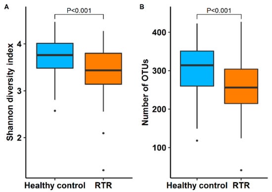 This is a figure showing the diversity of the gut microbiome of renal transplant recipients (RTRs) compared to healthy controls: (A) a boxplot depicting the Shannon diversity index, which is a measure for the diversity of the gut microbiome, was significantly lower in RTRs compared to healthy controls (p < 0.001); (B) a boxplot showing the number of observed operation taxonomic units (OTUs) between RTRs and healthy controls (p < 0.001).