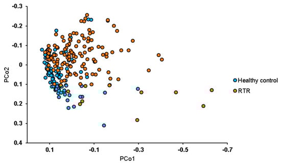 Principal coordinate analysis of 139 RTRs and 105 healthy controls. The principal coordinates plot shows principal coordinates for the Bray–Curtis distance, a measure for the composition of the gut microbiome, for RTRs and healthy controls. Separation in the composition of the gut microbiome between RTRs and healthy controls can be observed. PCo1 is principal coordinate 1 and PCo2 is principal coordinate 2. The gut microbiome of RTRs is significantly different from that of healthy controls in the first coordinate (PCo1 vs. PCo2: p < 0.01). RTR or healthy control status significantly explained 5.8% of variation in the gut microbiome (p < 0.001).