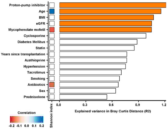 Depiction of variables that are associated with variation in the gut microbiome within RTRs. In the bar plots, the x-axis represents the percentage of explained variance in the gut microbiome of RTRs expressed as the Bray–Curtis distance. The heatmap depicts significant negative correlations (red) and positive correlations (blue) with the Shannon diversity index (p < 0.01). These variables were tested only in the gut microbiome of RTRs. Bars in orange represent variables which significantly explain variance in gut microbiota composition (p < 0.05).