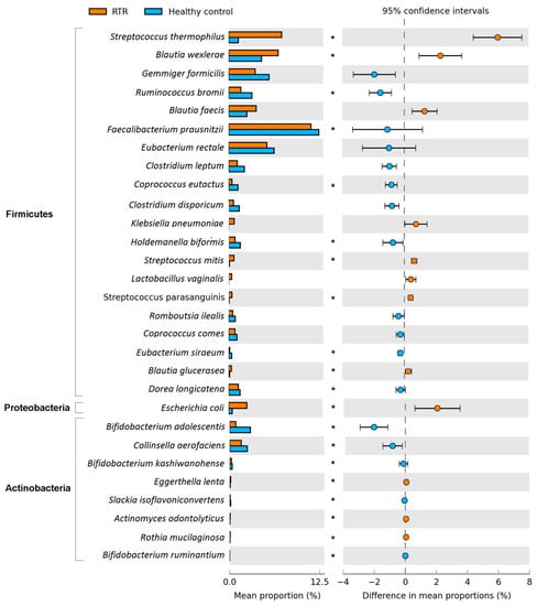 This figure depicts the abundance of phyla and species for RTRs and healthy controls. Bar plots represent the mean proportion and differences in mean proportions with 95% confidence intervals are depicted on the right. Taxa that are depicted were filtered for a difference in mean proportion >0.2%. pFDR < 0.10 was considered as statistically significant and indicated in the plot with a star (*).