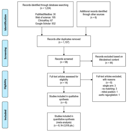 Systematic search of the online databases allowed collection of 58 potentially eligible records that were retrieved for scrutiny. Of those, 52 were further excluded because they were not pertinent to the design of the meta-analysis or did not meet the explicit inclusion criteria. One RCT [14] and five observational studies [15,16,17,18,19] enrolling the total of 2818 patients were eventually included in the analysis. Potential sources of the studies’ bias were analyzed with the use of components recommended by the Cochrane Collaboration and ROBINS-I tool, and the results are enclosed as Table A2. Overall, the studies reported moderate risk of bias. Most commonly, biases arose from participants selection for the study by designated heart teams and subjective distribution of the participants within the study arms. All but one study [14] lacked a core lab assessment of PVL and central adjudication of clinical events.