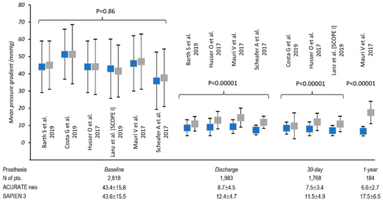 Groups treated with ACURATE neo and SAPIEN 3 did not differ regarding patients’ age (P = 0.363), body mass index (P = 0.708), NYHA III/IV status (P = 0.115) or left ventricle ejection fraction (P = 0.178). No difference was found in the baseline logistic EuroSCORE as well (P = 0.749). SAPIEN 3 group included significantly fewer female individuals, 59.7% vs. 64.1%, respectively (P = 0.037). Aortic valve baseline echo-parameters, i.e., mean trans-aortic gradient were comparable: 43.4 ± 15.8 vs. 43.6 ± 15.5 mmHg (P = 0.861) in ACURATE neo and SAPIEN 3, respectively (Figure 2), although the aortic annulus plane area were on average 4 mm2 smaller in the ACURATE neo recipients 439.7 ± 62.4 vs. 446.7 ± 76.3; P = 0.037 as compared to SAPIEN 3. Transfemoral access was mostly widely employed during TAVR procedure; in five studies, it was used exclusively [14,16,17,18,19]. Barth et al. [15] included both transfemoral and transapical access in 75.7% vs. 24.3% and 74.5% vs. 25.5% for ACURATE neo and SAPIEN 3, respectively. For the transapical approach, ACUARATE TA device was used.