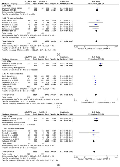 Individual and summary risk ratios with corresponding 95% confidence intervals for the comparison of ACURATE neo vs. SAPIEN 3 in the analysis of clinical outcomes: (a) early safety, (b) device success and (c) permanent pacemaker implantation.