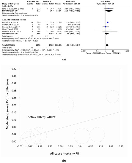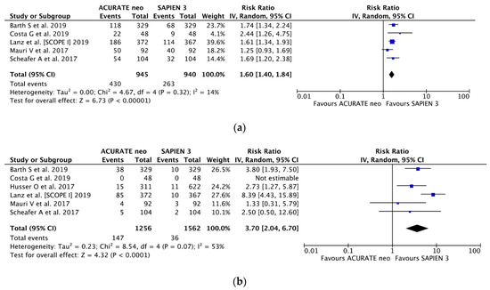 Individual and summary risk ratios with corresponding 95% confidence intervals for the comparison of ACURATE neo vs. SAPIEN 3 in the analysis of functional outcomes: (a) mild and (b) moderate-to-severe paravalvular leak.