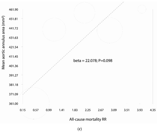 Individual and summary risk ratios with corresponding 95% confidence intervals for the comparison of ACURATE neo vs. SAPIEN 3 in the analysis of (a) 30-day all-cause mortality; (b,c) meta regression analyses.