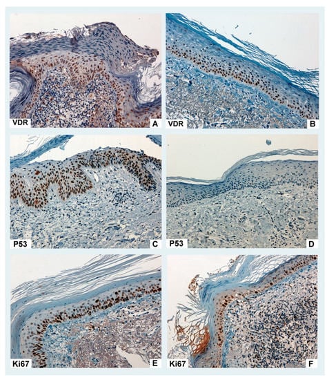 Actinic keratoses: immuno-histochemical response to MAL-PDT (methyl-aminolevulinate photodynamic therapy). Baseline vitamin D receptor (VDR) expression (A) did not significantly change after treatment (B). Baseline P53 (C) and Ki67 (E) expression significantly decreased (D and F, respectively) after PDT.