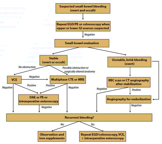 The most common etiologies of small bowel bleeding include inflammatory bowel disease (IBD), a Meckel’s diverticulum, Dieulafoy lesion, or a small bowel neoplasm (for e.g., GI stromal tumor, lymphoma, adenocarcinoma, carcinoid or polyp) in patients less than 40 years of age, and vascular lesions including angioectasias, ulcers or erosions secondary to NSAID use, and less commonly neoplasms in those over 40 years of age [128,129]. The evaluation of suspected small bowel bleeding typically starts with a repeating an upper endoscopic evaluation with either an EGD or PE and colonoscopy prior to evaluation of the small bowel with VCE, DAE, multiphase CT enterography (CTE), magnetic resonance enterography (MRE) or intraoperative enteroscopy (IOE). Definitive treatment of lesions that are amenable to endoscopic interventions, whether through PE or DAE, is similar to that in other parts of the GI tract. A suggested algorithm for endoscopic evaluation of suspected overt and occult small bowel bleeding by the American Society of Gastrointestinal Endoscopy (ASGE) is presented in Figure 4 [9].