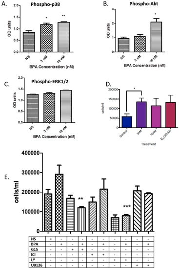 (A,B). Relative amount of phospho-p38 (A) and phospho-Akt after 60 min of bisphenol A (BPA) treatment (3 nM and 10 nM). Treatment of BeWo cells with 3 nM and 10 nM BPA significantly increased the expression of p-p38 after 60 min (* p < 0.05 and ** p < 0.01 compared to no supplement (NS)) (A). Treatment of BeWo cells with 10 nM BPA significantly increased the expression of p-AKT after 60 min (* p < 0.05 compared to NS) (B). Both protein expression of the housekeeping gene GAPDH and of total p38 remained unchanged; (C). There was no difference in the phosphorylation status of ERK1/2 when cells were treated with BPA for 60 min; (D). Changes in BeWo cell number treated with 3 nM BPA, 10 nM BPA, and 30 nM estradiol (E2). The 3 nM BPA treatment significantly increased cell number compared to controls (p < 0.05), while there was a notable, but not significant, increase in number when cells were treated with 10 nM BPA or 30 nM E2; (E). Changes in the number of BeWo cells treated with 3 nM BPA and/or estrogen receptor (ER) antagonists (i.e., ICI 182,780 (ICI): ERα and ERβ inhibitor, G15: GPR30 inhibitor). Cell number of BPA-treated cells was significantly decreased when treated with G15 (p < 0.05). There was also a significant decrease in cell number when cells were treated with LY294002 (LY), as well as for the treatment with BPA + LY294002 when compared to controls and treatment with only BPA (*** p < 0.001 compared to control). There was a decrease in cell number when cells were treated with U0126 or BPA + U0126 when compared to treatment with only BPA just short of significance (p = 0.05).