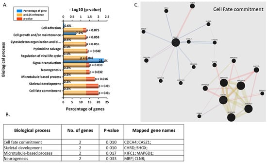 (A) Top 10 enriched (Funrich) biological processes for 3 nM BPA-treated BeWos. (B) Table of genes involved in biological processes: cell division cycle associated 4 (CDCA4); castor zinc finger 1 (CASZ1); chondrin (CHRD); short stature homeobox (SHOX); kinesin family member C1 (KIFC1); MAP6 domain containing 1 (MAP6D1); myelin basic protein (MBP); ceroid-lipofuscinosis, neuronal 8 (CLN8). (C) Network annotation of genes involved in cell fate commitment (Genemania).