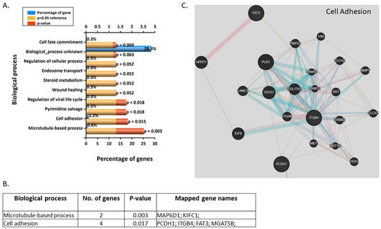 (A) Top 10 enriched (Funrich) biological processes for 10 nM BPA-treated BeWos. (B) Table of genes involved in biological processes: protocadherin 1 (PCDH1), FAT atypical cadherin 3 (FAT3mannosyl (alpha-1,6-)-glycoprotein beta-1,6-N-acetyl-glucosaminyltransferase, isozyme B (MGAT5B). (C) Network annotation of genes involved in cell adhesion (Genemania).