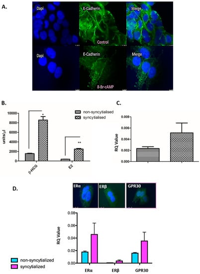 (A) Immunofluorescent staining of E-Cadherin (a marker of cell fusion) in BeWo cells treated with 8-bromo-cAMP (8-Br-cAMP) in order to syncytialise. Green: E-Cadherin; blue: DAPI nuclear stain (a blue fluorescent dye used to detect nuclei in fluorescence microscopy). Cells depicted in the bottom row have been treated with 8-Br-cAMP for 72 h, while cells depicted in the top row have not (controls). As BeWo cells treated with 8-Br-cAMP fuse to become syncytia (amorphous and multinucleated cells), cell walls break down and lose E-Cadherin. (B) Secretion of estradiol (E2) and β-human chorionic gonadotropin (β-hCG) in conditioned media of nonsyncytialised and syncytialised BeWo cells grown for 24 h. Expression of both β-hCG and E2 was significantly upregulated in syncytialised BeWo cells (p = 0.0108 and p = 0.0042, respectively) compared to nonsyncytialised BeWo cells. (C) Expression of syncytin-2 (a marker of syncytialisation) in nonsyncytialised and syncytialised BeWo cells, showing a more than 2-fold increase in syncytin-2 in the latter (relative quantities are levels of the gene of interest in relation to quantities of housekeeping gene TOP1). (D) All three estrogen receptors (ERα, ERβ, and GPR30) were also present in syncytialised BeWo cells compared to nonsyncytialised BeWo cells. (Insert in D). Immunostaining of syncytialised BeWo cells for estrogen receptors; merged images. Green: receptor; blue: DAPI nuclear stain. ERα and ERβ show a more nuclear staining pattern, whereas GPR30 staining is more focused around the cell membrane.