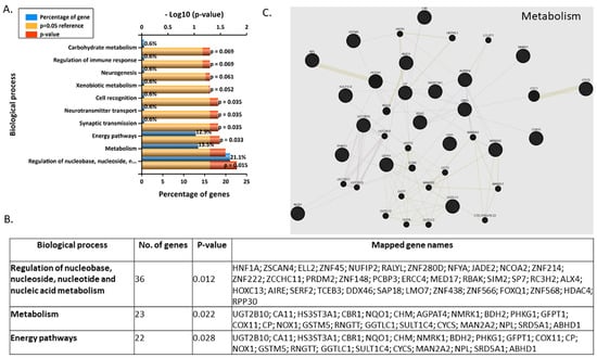 (A) Top 10 enriched (Funrich) biological processes for 3 nM BPA-treated syncytialised BeWos. (B) Table of genes involved in most significant biological processes. (C) Network annotation of genes involved in metabolism (Genemania; Supplementary Table S4).