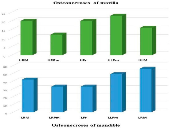 Localizations of ONJ by regions (Abbreviations: URM—upper right molar, URPm—upper right premolar, Ufr—upper frontal, ULPm—upper left premolar, ULM—upper left molar, LRM—lower right molar, LRPm—lower right premolar, LFr—lower frontal, LLPm—lower left premolar, LLM—lower left molar).