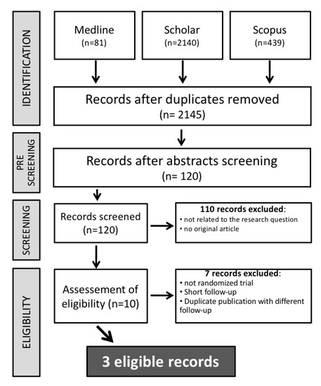 Our search retrieved a total of 2660 entries, which were reduced to 2145 studies after an initial pre-screening. A total of 110 studies were then excluded for one of the following reasons: (a) they were not related to our research question; (b) they were not original articles. In the assessment of eligibility, a further seven studies were excluded. Finally, a total of three studies were included [7,8,17]. The study selection procedure was reported in detail in Figure 1.