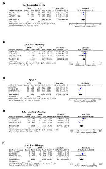 Meta-analysis of cardiovascular death, all-cause mortality, new-onset atrial fibrillation, life-threating bleeding, acute kidney injury II or III stage. (A) Forest plot and summary effect of the difference in the incidence of cardiovascular death, showing a significantly lower incidence in the TAVR arm (p = 0.03). (B) Forest plot and summary effect of the difference in the incidence of all-cause mortality showing no difference between transcatheter aortic valve replacement (TAVR) and surgical aortic valve replacement (SAVR; p = 0.10). (C) Forest plot and summary effect of the difference in the incidence of new-onset atrial fibrillation, showing a significantly lower incidence in the TAVR arm (p < 0.001). (D) Forest plot and summary effect of the difference in the incidence of life-threating bleeding, showing a significantly lower incidence in the TAVR arm (p < 0.002). (E) Forest plot and summary effect of the difference in the incidence of acute kidney injury II or III stage, showing a significantly lower incidence in the TAVR arm (p < 0.0005).