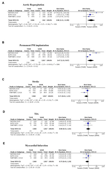 Meta-analysis of aortic regurgitation, permanent PM implantation, stroke, transient ischemic attack (TIA) and myocardial infarction. (A) Forest plot and summary effect of the difference in the incidence of aortic regurgitation, showing a significantly lower incidence in the SAVR arm (p = 0.01). (B) Forest plot and summary effect of the difference in the incidence of permanent PM implantation, showing a significantly lower incidence in the SAVR arm (p = 0.01). (C) Forest plot and summary effect of the difference in the incidence of stroke, showing no difference between TAVR and SAVR (p = 0.24). (D) Forest plot and summary effect of the difference in the incidence of TIA, showing no difference between TAVR and SAVR (p = 0.96). (E) Forest plot and summary effect of the difference in the incidence of myocardial infarction, showing no difference between TAVR and SAVR (p = 0.29).
