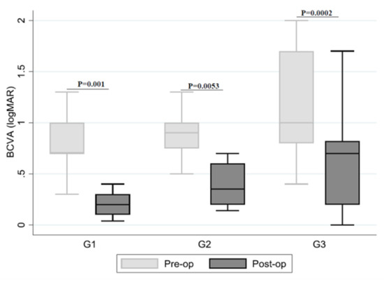 Relationship between pre- and post-op logMAR and groups (median, IQR, range). Legend: BCVA pre-op = best corrected visual acuity before surgery; BCVA post-op = best corrected visual acuity after surgery; logMAR = Logarithm of the Minimum Angle of Resolution; Statistical analysis was performed using the Wilcoxon Signed Rank Test.
