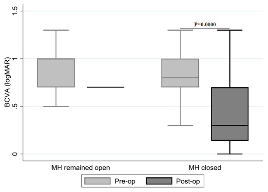 Relationship between pre- and post-op logMAR and closure of the macular hole (median, IQR, range). Statistical analysis was performed using the Wilcoxon Signed Rank Test.