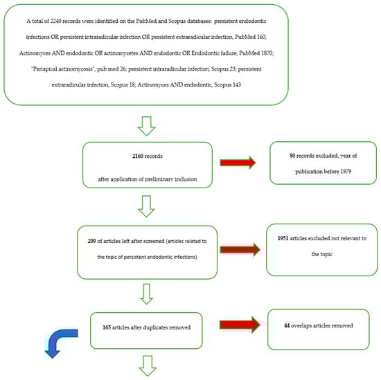Articles considered to be potentially eligible are those studies that talk about of the role of bacteria in endodontic infections with particular attention to selecting articles dealing with the role of Actinomyces in persistent extraradicular infections.