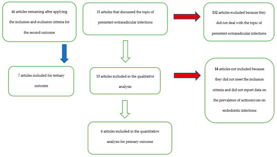 Previously, Zhang et al. included in 2015 10 studies on E. faecalis, analyzing a total of 927 teeth and concluded that such bacteria are more highly correlated with persistent intraradicular infections compared with untreated chronic periapical periodontitis []. Very recently, Manoli et al. published a systematic review including 26 studies that used new sequencing technologies aiming at redesigning a new map of the bacterial taxa associated with endodontic infections. Such review identified bacteria with a higher prevalence in infections but found no significant difference in the three groups analyzed (primary apical periodontitis, secondary apical periodontitis, and apical abscess) []. Such literature reviews, conducted over the past five years, have only marginally investigated the role of Actinomyces in persistent extraradicular infections. Only few of them focused on extraradicular bacterial biofilms, and only a few of these report data on the prevalence of Actinomyces in endodontic infections. This review differs from the previous ones because it focuses on the prevalence of bacteria of the genus Actinomyces in endodontic infections.