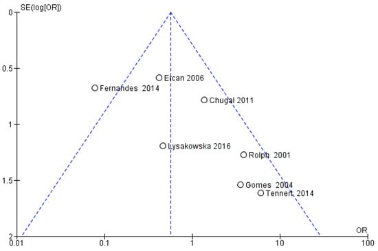 The risk of bias between the studies is considered very high for the primary and secondary outcome; in fact, the heterogeneity that emerges from the meta-analysis shows an I2 equal to 88.09% for the primary outcome and 90.96% for the secondary outcome. For the tertiary outcome, the risk of bias between the studies was assessed through the funnel plot for the seven articles included (Figure 2).