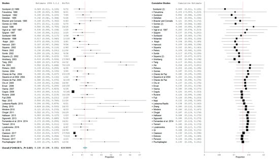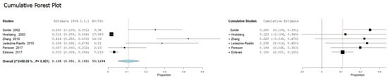For the secondary outcome, the heterogeneity was very high with an I2 equal to 90.96%. For that reason, a random effects model was used. The cumulative meta-analysis presents a pooled proportion (I2 = 90.96%, p value < 0.001) of 0.130 (0.108, 0.151) with a ratio between events and samples examined equal to 418/4406 (Figure 4).