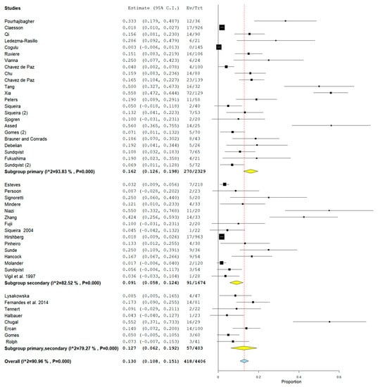 In consideration of the high heterogeneity of the studies, an analysis of the subgroups for the secondary outcome was also conducted. Studies were divided into primary, secondary, and primary/secondary, based on whether they investigated the presence of bacteria of the genus Actinomyces in teeth with primary or secondary infection or in both. The results are reported in Figure 5.