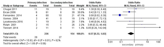 For the tertiary outcome—difference in the prevalence of bacteria of the genus Actinomyces between primary endodontic infections and secondary endodontic infections—the comparison showed average heterogeneity among the studies, with an I2 equal to 62%. Results reported in Figure 6 show that the rate of Actinomyces infection was higher in secondary than in primary endodontic infection (OR = 0.57, 95%CI: (0.32, 1.02)).