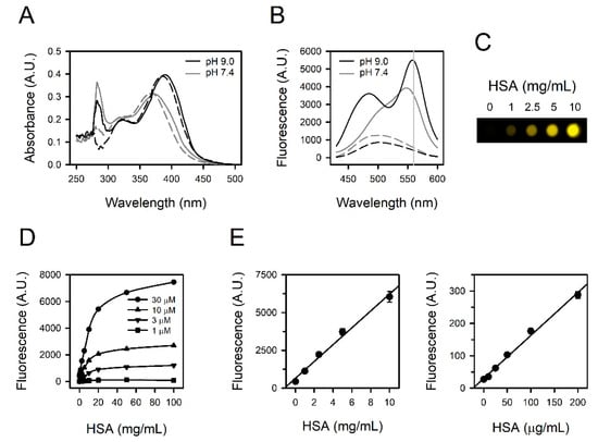 Fluorescence spectra and titration curves obtained from fisetin and HSA. (A) The absorbance spectra and (B) the emission spectra from excitation at 400 nm were obtained from 30 μM fisetin at pH 7.4 (gray lines) or pH 9.0 (black lines) in the presence (solid lines) or absence (dashed lines) of 5 mg/mL HSA. A gray vertical reference line was drawn at 560 nm (B). (C) The fluorescence image of HSA-containing fisetin solutions was obtained at excitation at 400 nm. (D) The titration curves were acquired with 0–30 μM fisetin and 0–100 mg/mL HSA. (E) The standard curves were prepared with 30 μM fisetin and 0–10 mg/mL HSA (left panel) or 1 μM fisetin and 0–200 μg/mL HSA (right panel). The values are presented as means ± standard errors (n = 3).