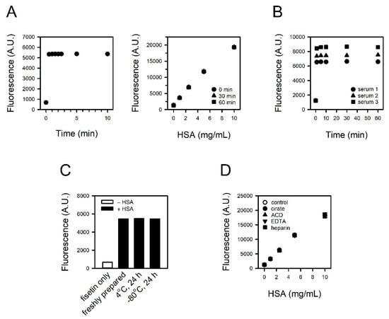 Reaction rate, signal stability, and the impact of sample storage condition and anticoagulants on assay. (A) The fluorescence was measured from 0.5 to 10 min after inducing the reaction of 30 μM fisetin and 5 mg/mL HSA (left panel). The stability of the fluorescence signal was tested up to 60 min (right panel). (B) The fluorescence from 30 μM fisetin and 10% serum was measured from 1 to 60 min. (C,D) The HSA solutions were prepared (C) freshly or kept at 4 °C or −80 °C for 24 h, and (D) to contain citrate, ACD, EDTA or heparin. They were reacted with fisetin, and the fluorescence intensities were measured.