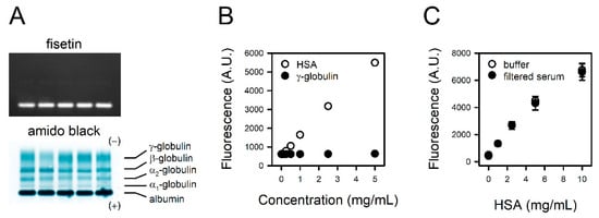 Specificity of fisetin to HSA. (A) The proteins in human sera from five donors were separated on agarose gel. The gels were stained with fisetin (upper panel) or amido black (lower panel). (B) The HSA or γ-globulin solutions were reacted with fisetin, and the fluorescence was measured. (C) The serum was filtered with 3 kDa cut-off filter. Titration curves were obtained with fisetin and HSA solubilized in BBS or serum filtrate. The values are presented as means ± standard errors (n = 3).